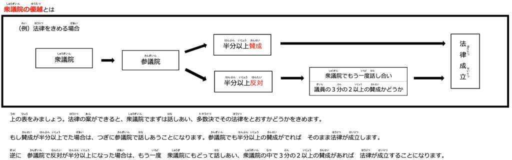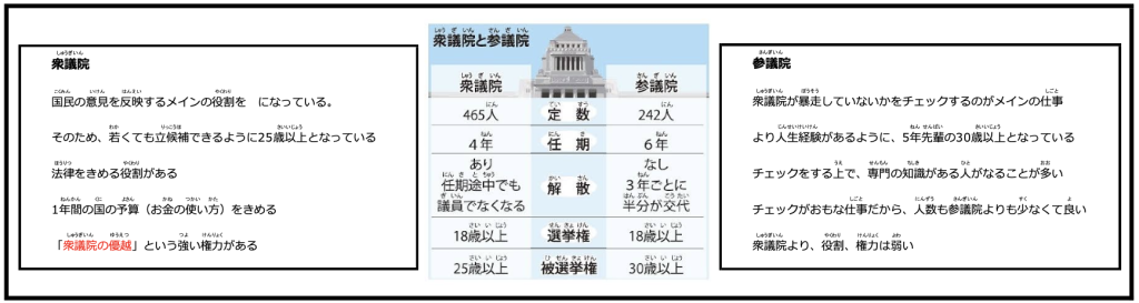 2024年10月25日 / 最終更新日時 : 2024年10月25日 jumpkidsforschool ディスカッション ディスカッションまとめ10/21〜10/24「衆議院と参議院」今週は「衆議院と参議院」についてディスカッションを行いました。★リーダーの意見今回の課題は、「衆議院と参議院の違いを与党と野党の言葉を使って説明してください」というものでした。政治の仕組みや流れなどを解説して、質疑応答タイムを設けてから。1人ずつ(低学年はペアで)、別室にてプレゼンをしてもらいました。知識を聞く(input)だけでなく、自らの言葉で発信する(output)ことで、より深く理解できたと思います。\ 最新情報をチェック /FacebookXBlueskyHatenaCopy