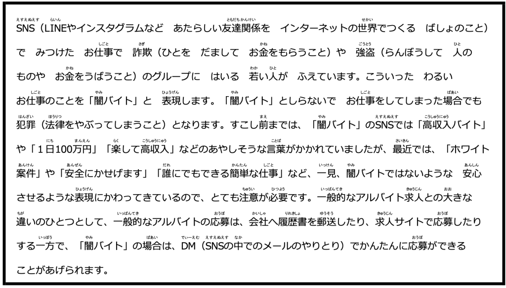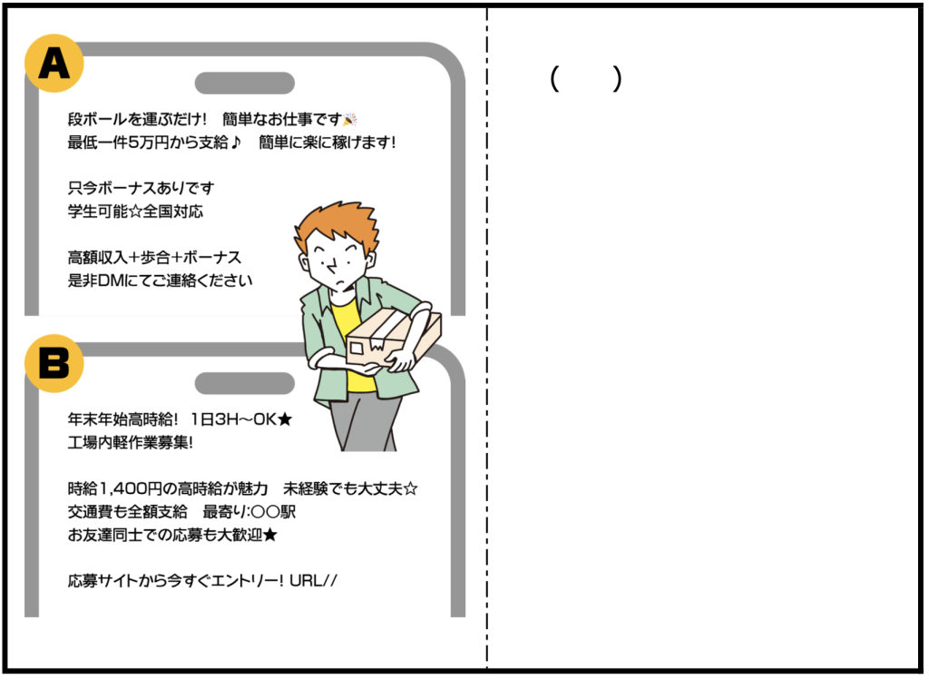 Q1.下に、ふたつの求⼈募集があります。どちらが「闇バイト」でしょうか。( )にAかBを かきましょう。また、それはどんなところからわかりますか。あなたの意見を書きましょう。