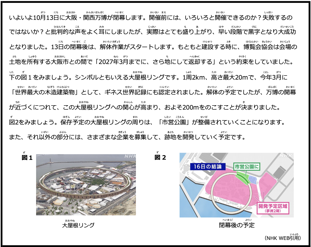 万博について、大屋根リングを一部残すことが決まりましたが、耐火性、防腐処理まではしていなかったため、長期保存のために追加で建築強化されることが決まりました。